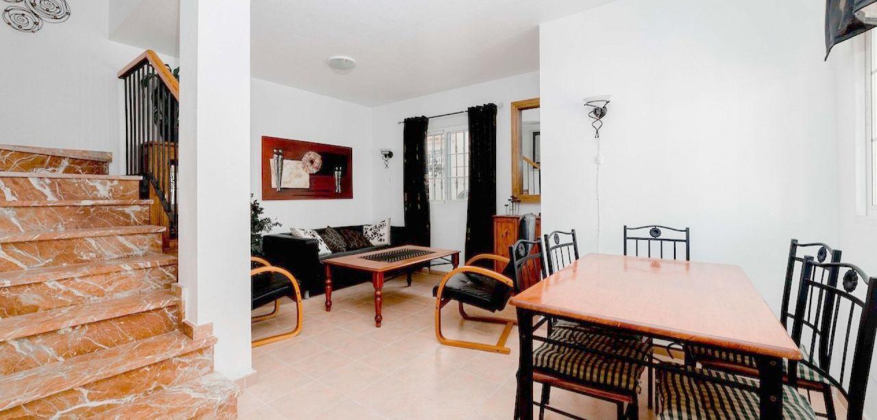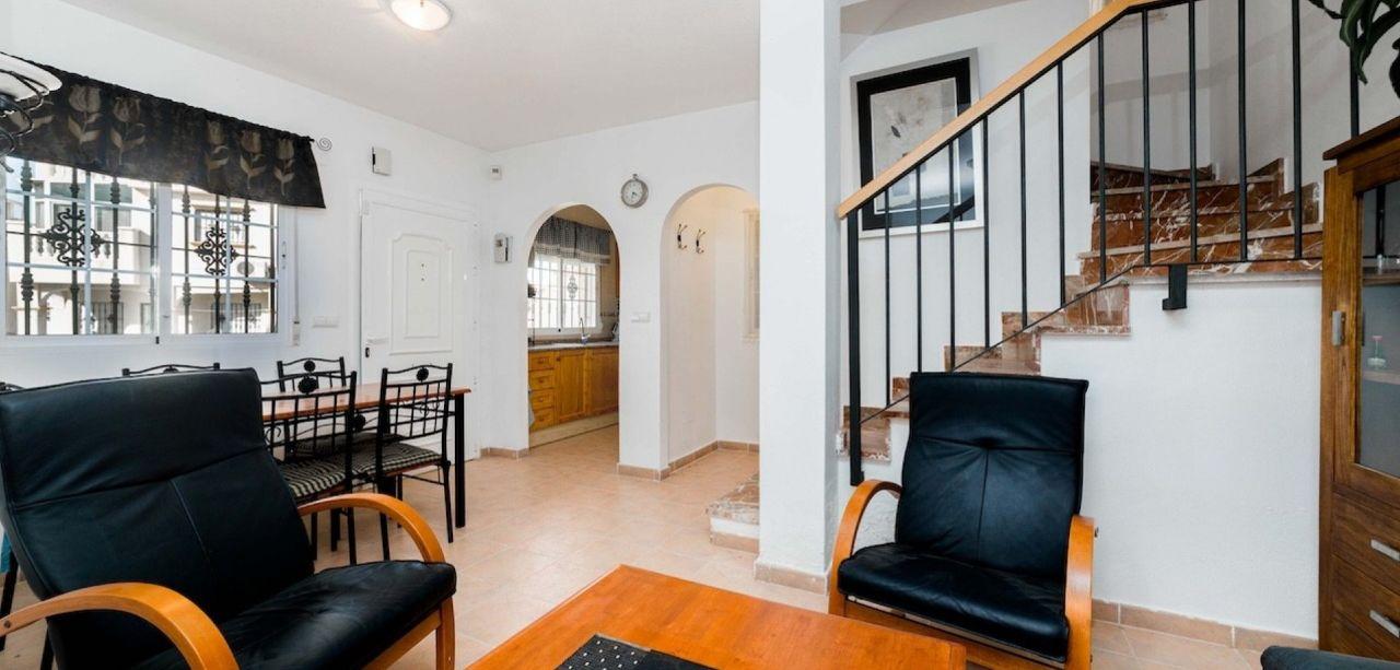 Realitná kancelária Leaders & Partners vám ponúka na predaj zariadený trojpodlažný apartmán 3+kk (62 m²) s niekoľkými terasami, vlastným parkovacím miestom a vlastným pozemkom (87 m²). Apartmán sa nachádza v rezidenčnom komplexe radových domov so spoločným bazénom, neďaleko profesionálneho golfového ihriska v meste Villamartin v Španielsku, vzdialeného asi 4,5 km od pláže Playa Flamenca.