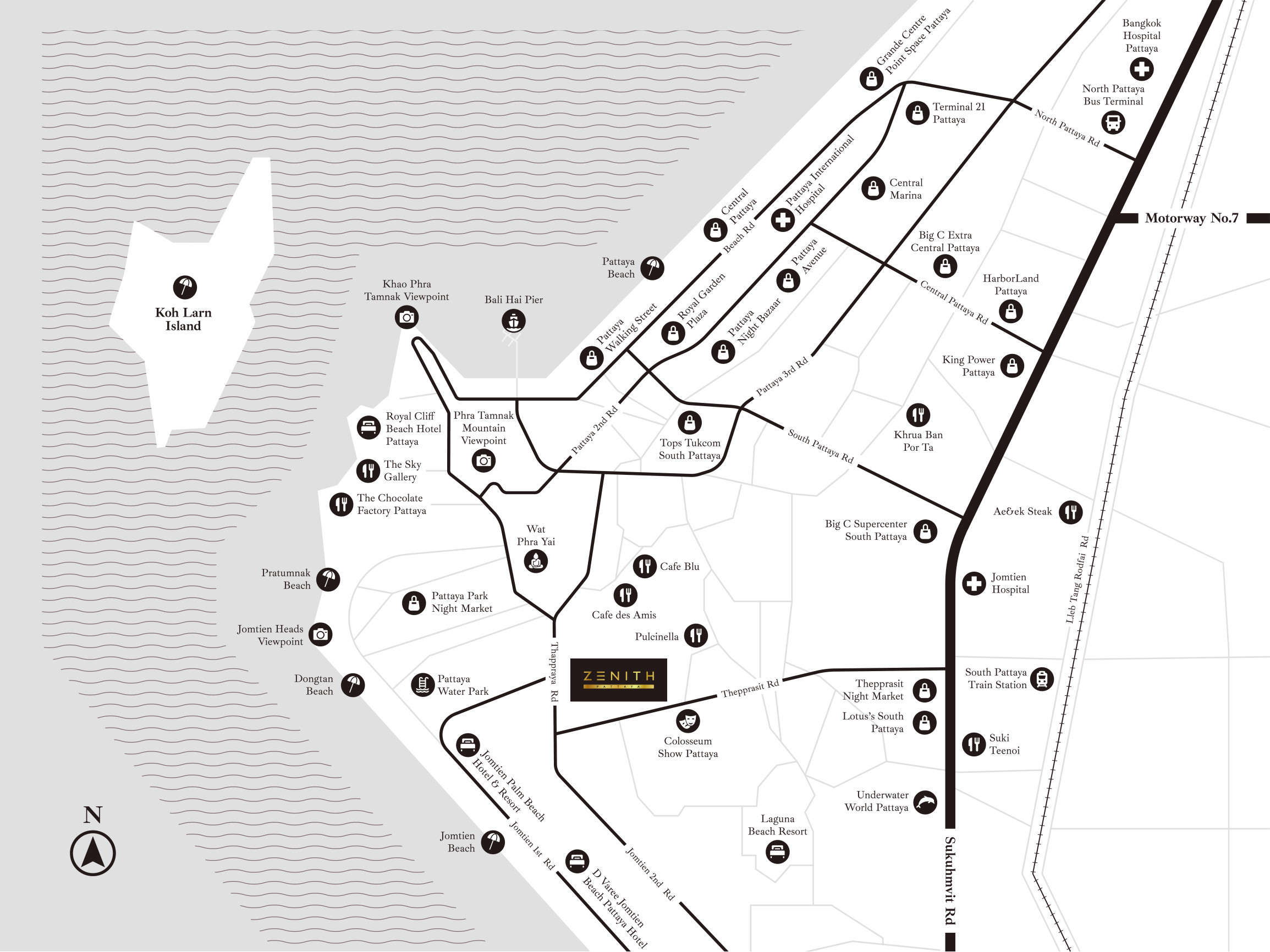 Zenith Pattaya má strategickú polohu len pár minút od hlavných dopravných spojení a poskytuje obyvateľom bezkonkurenčné pohodlie. Vďaka tesnej blízkosti známych golfových ihrísk a dvoch veľkých medzinárodných letísk – U-Tapao v Sattahip a Suvarnabhumi v Bangkoku – tento komplex zaisťuje bezproblémovú konektivitu. Zenith Pattaya sa nachádza v troch sedemposchodových budovách v rozľahlej oblasti s nádychom japonskej architektúry a dizajnu. Komplex ponúka 582 skvele navrhnutých apartmánov.