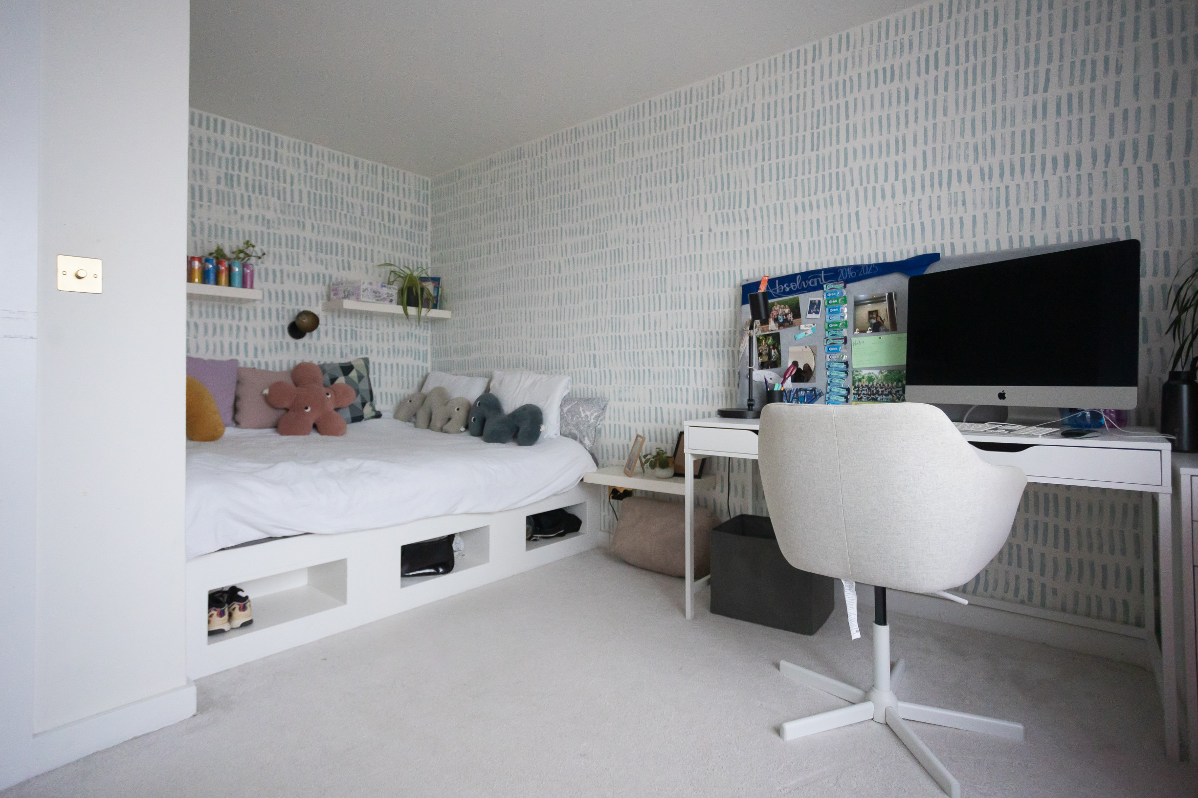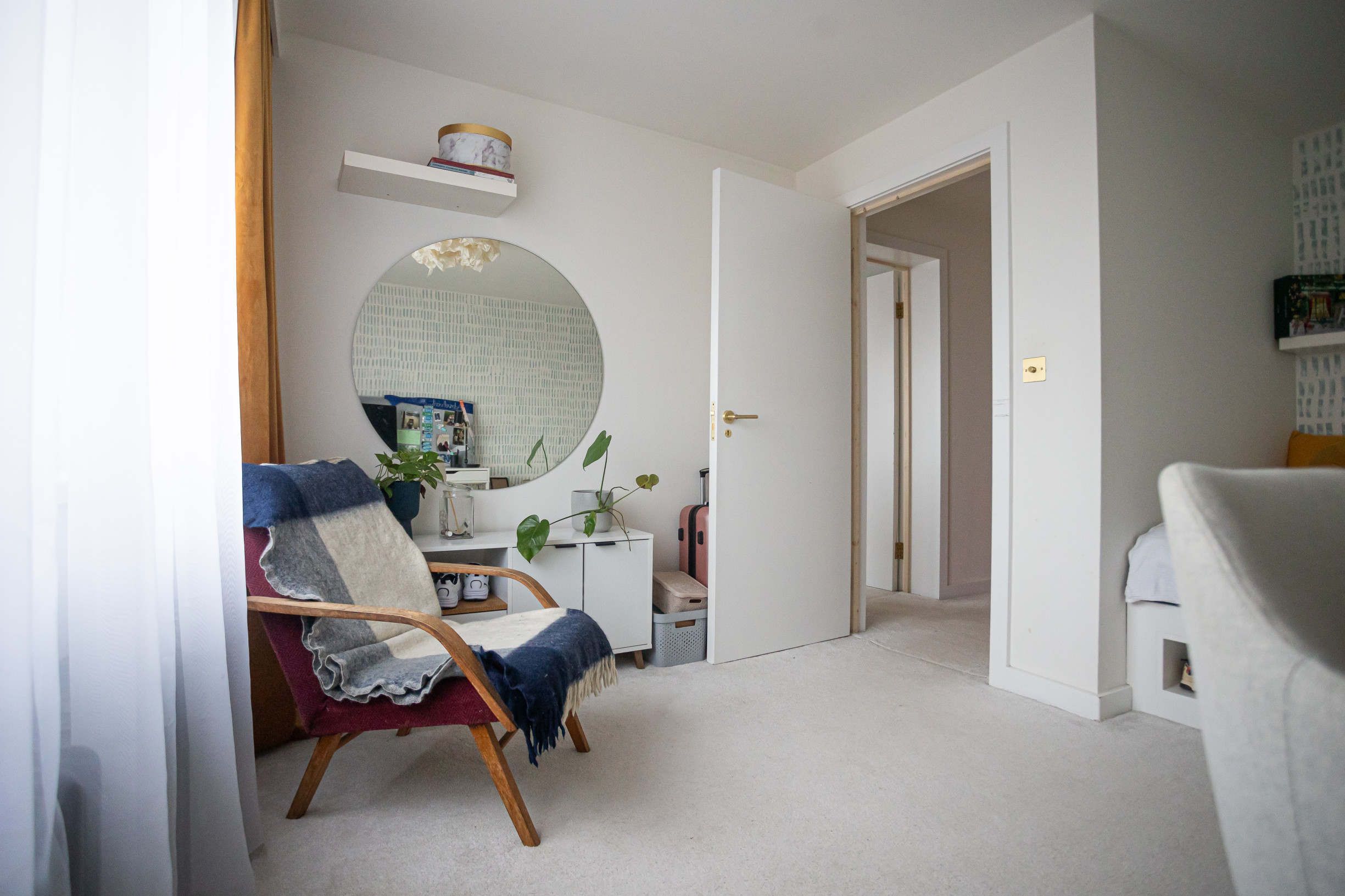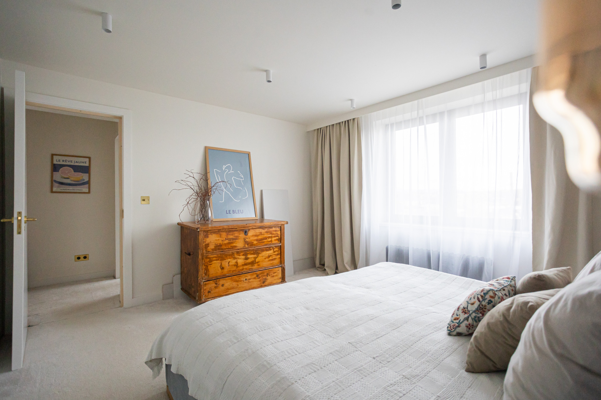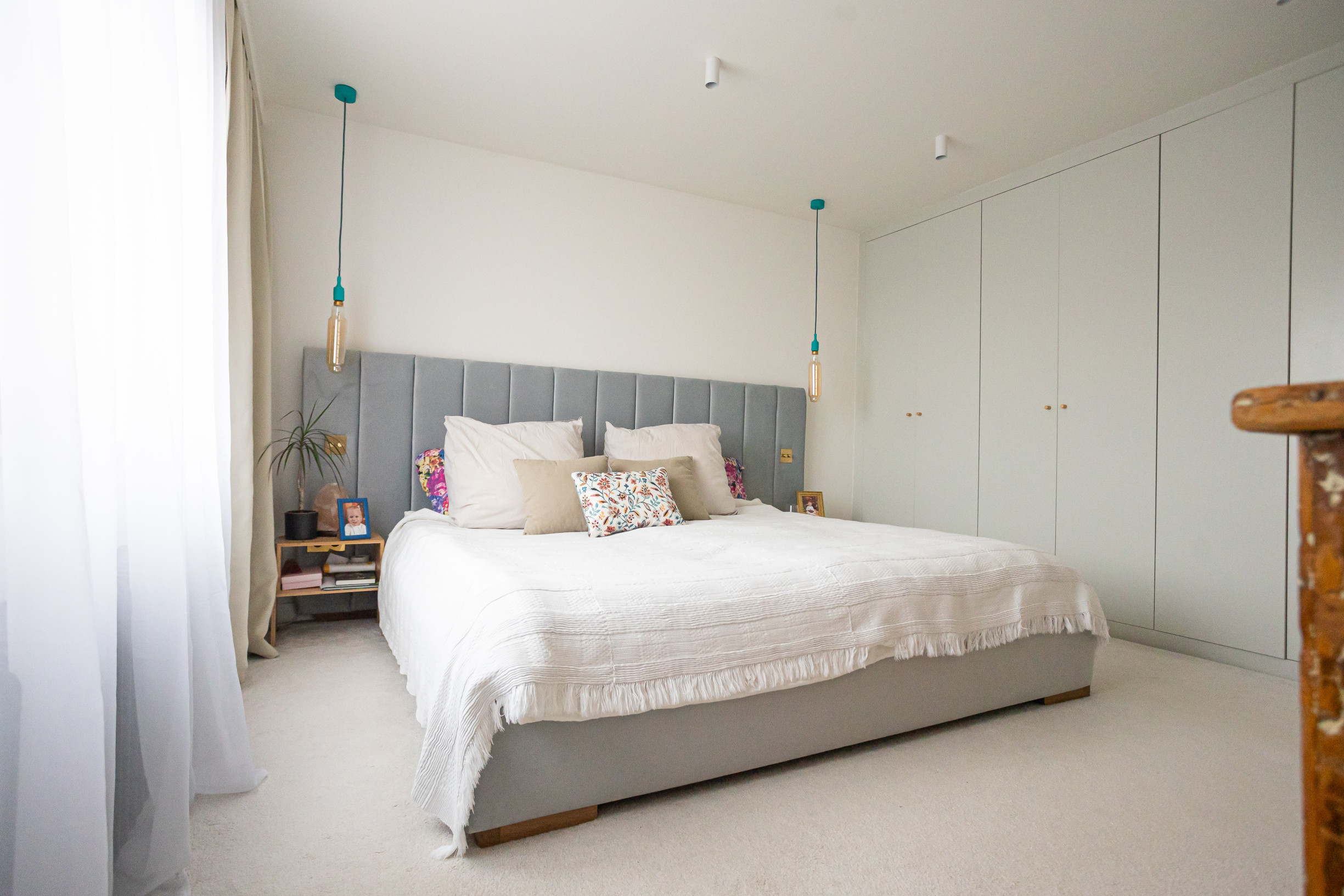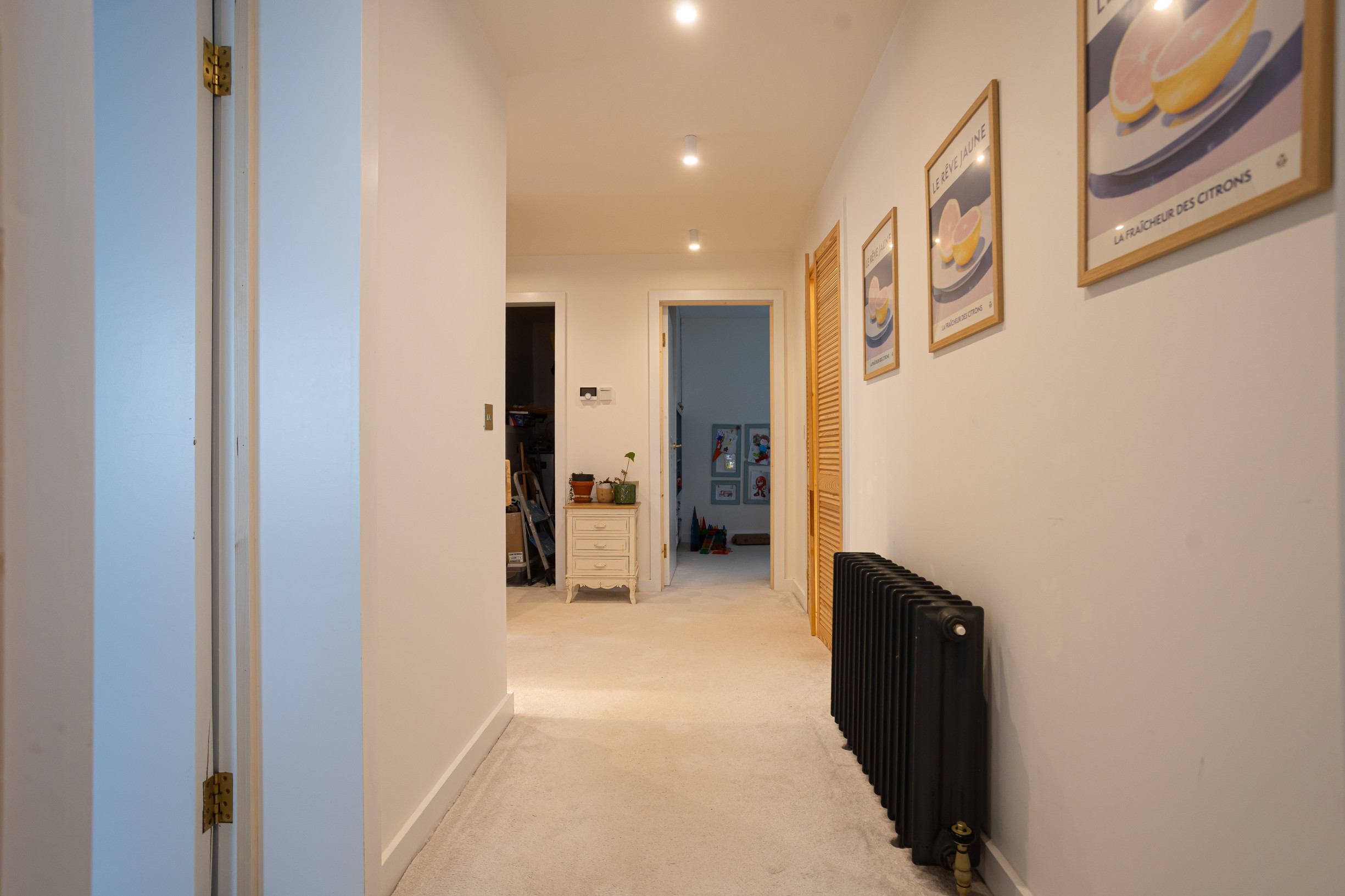 Spálňa so vstavanou skriňou. Detská izba so vstavaným nábytkom.Veľký šatník, technická miestnosť. Kúpeľňa s vaňou, oknom a radiátorom. Znížené stropy v celom podlaží. Radiátory v izbách, termostat na poschodí