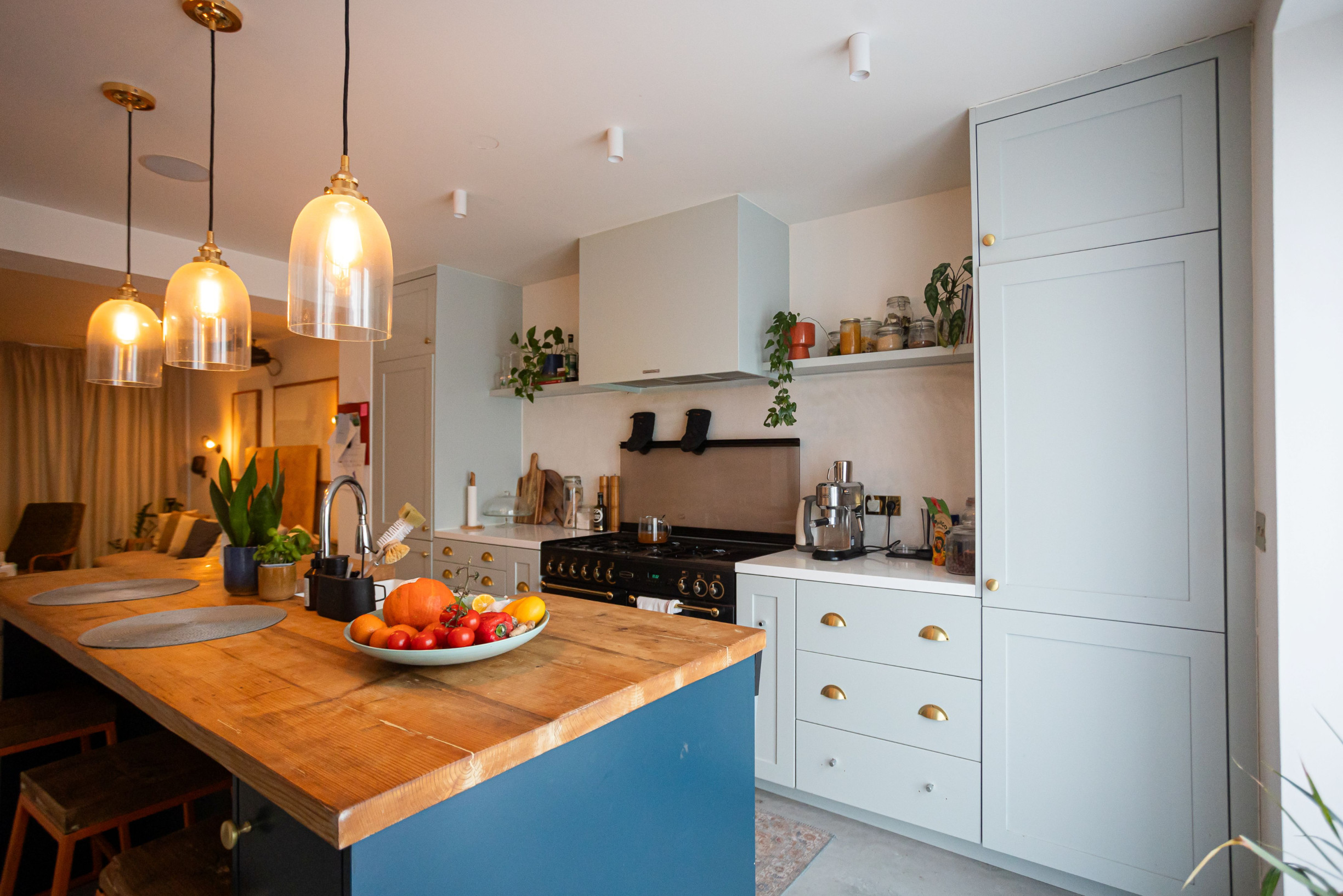 Moderná kuchyňa na mieru (2021) s ostrovčekom a vstavanými spotrebičmi, umývačka riadu Gorenje, varná doska Rangemaster s 5 plynovými horákmi, 2 rúry a gril. Kuchyňa je prepojená s obývacou izbou s vstavaným nábytkom. Výstup z obývačky na terasu a do záhrady. Podlahové kúrenie na celom prízemí.Liaty leštený betón. Kúpeľňa so sprchovým kútom a vstavaným nábytkom. Priestor pre práčku a sušičku. Vinotéka, potravinová skriňa