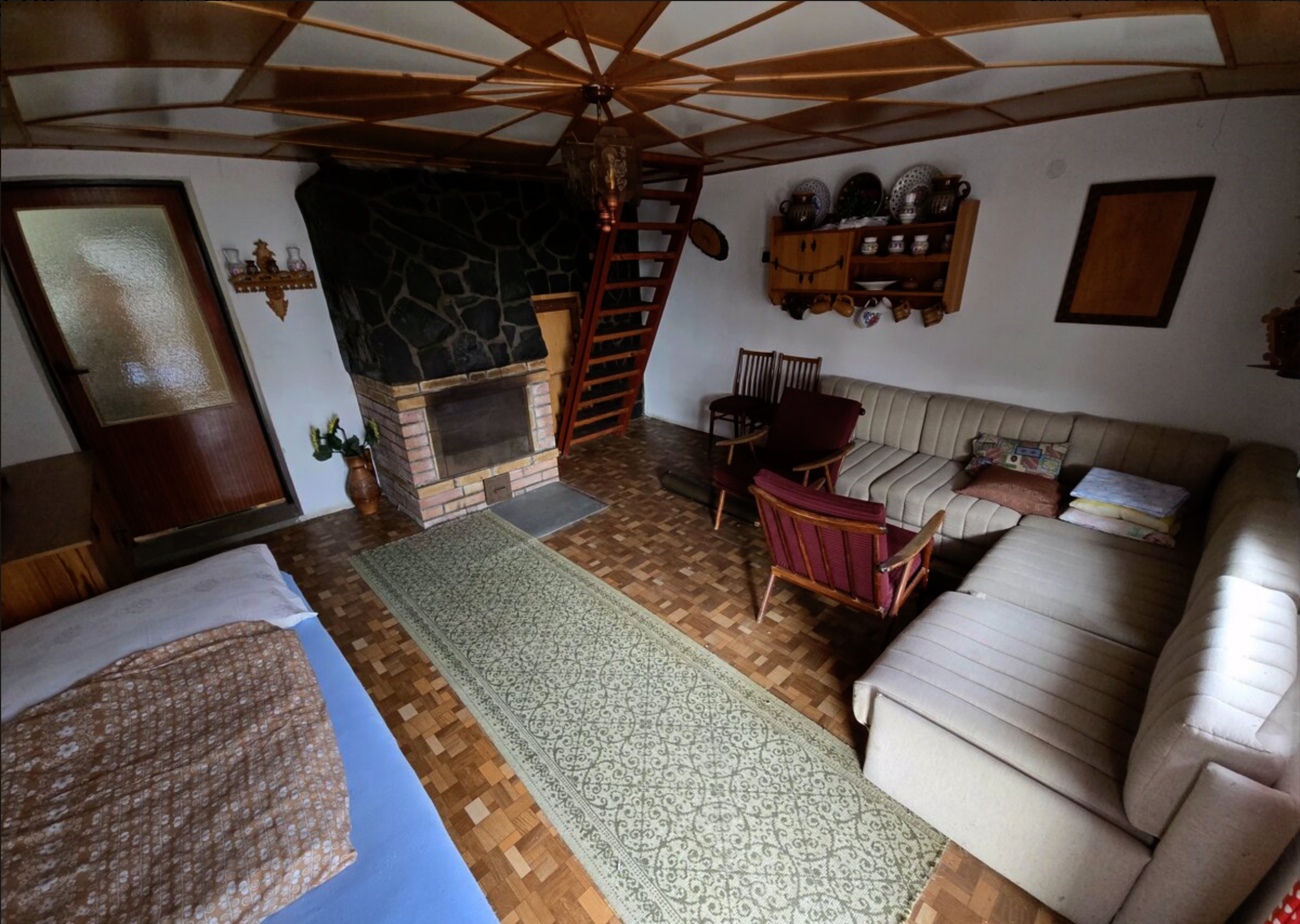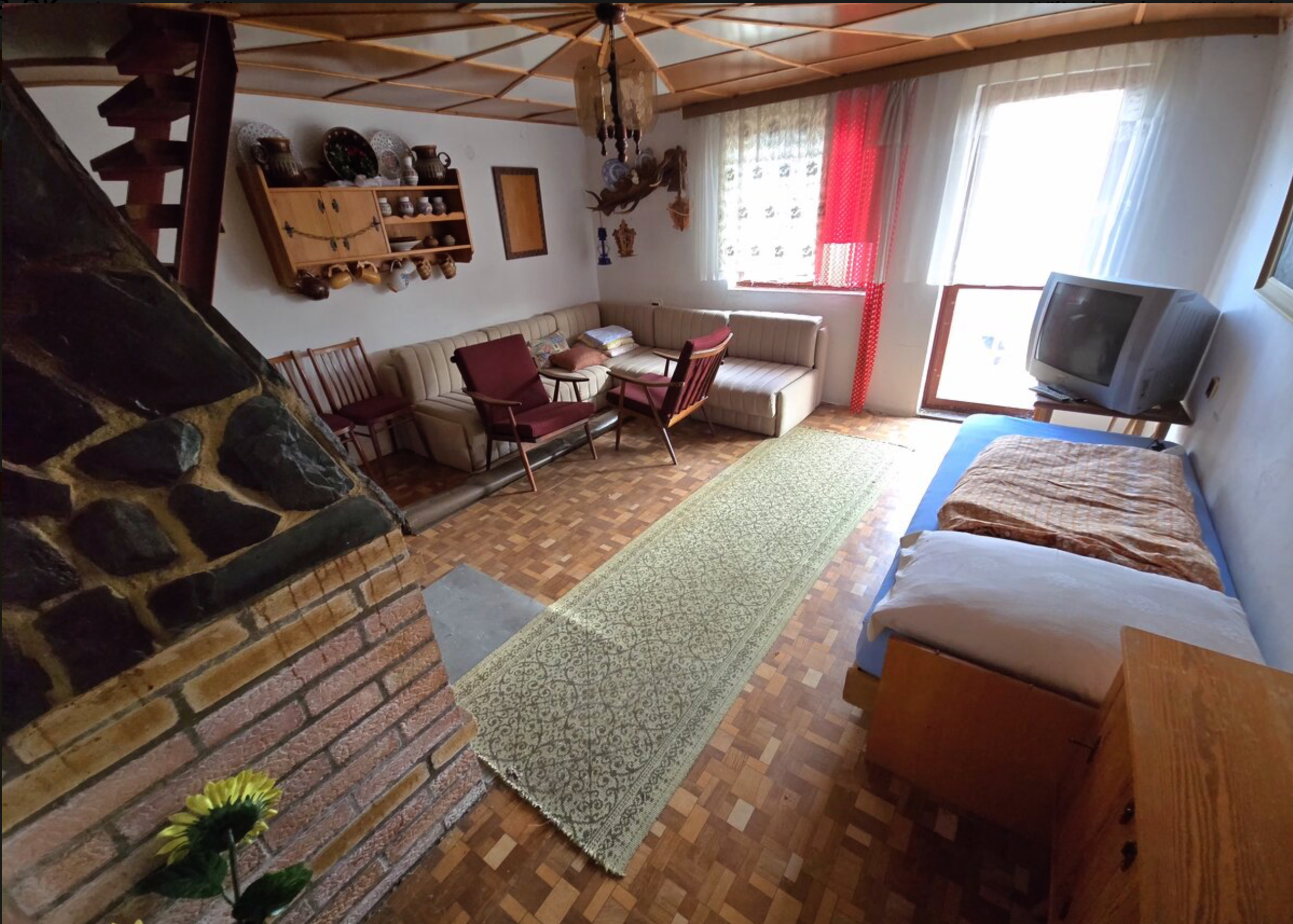 2. podlažie: obývacia izba s funkčným krbom, kúpeľňa so sprchou a WC, balkón