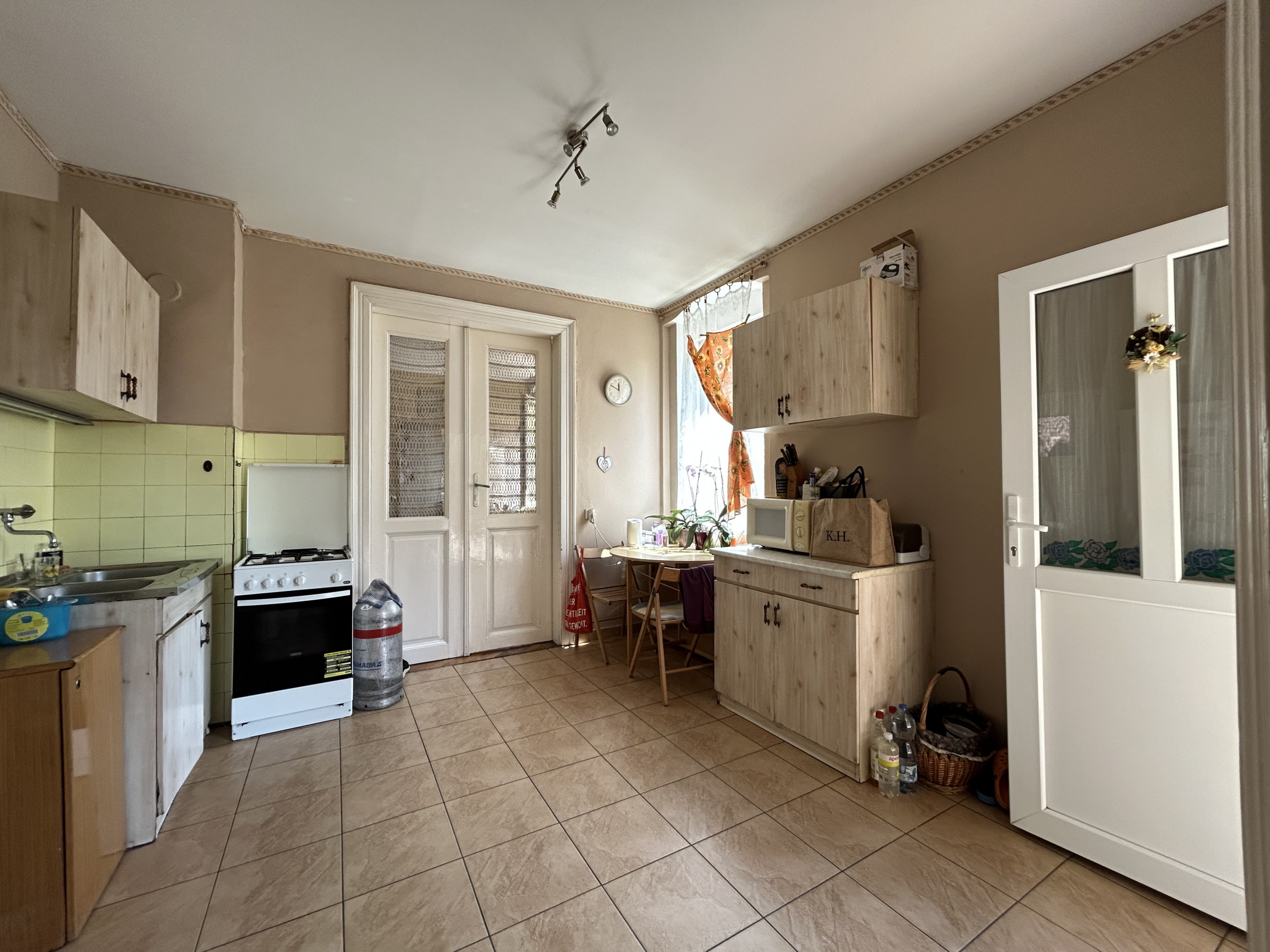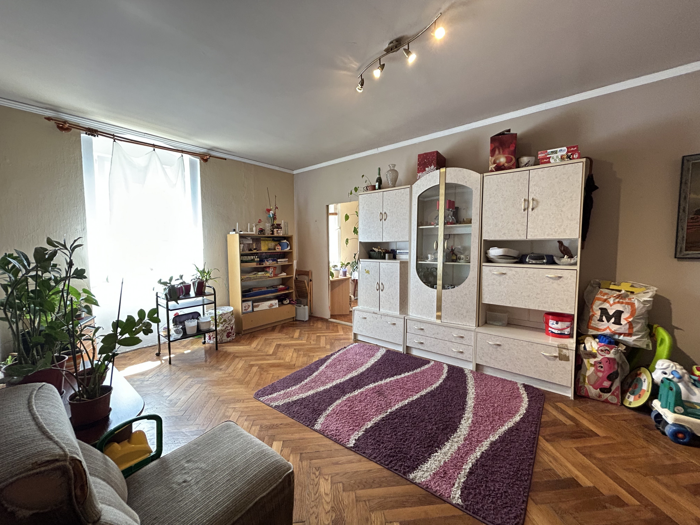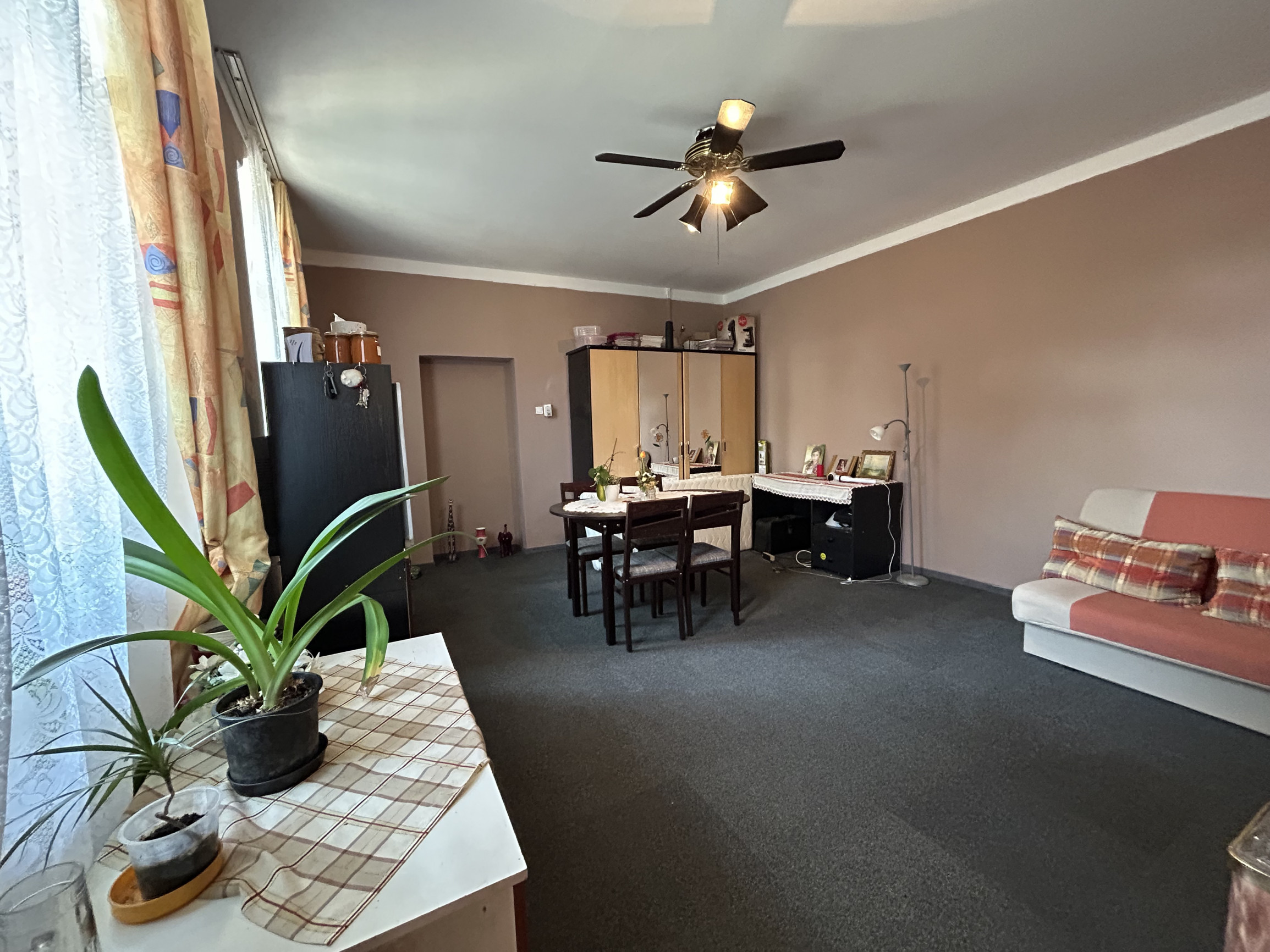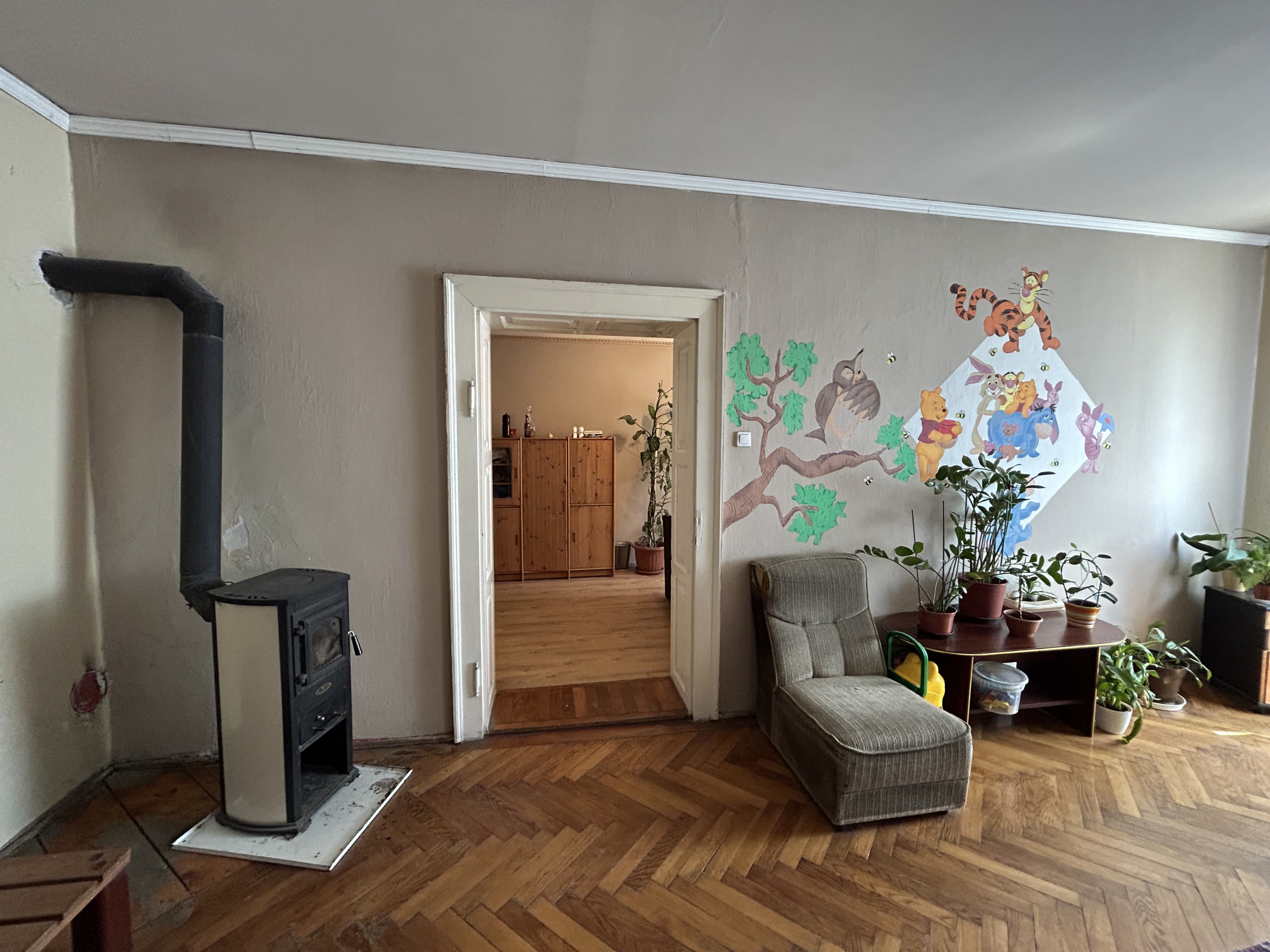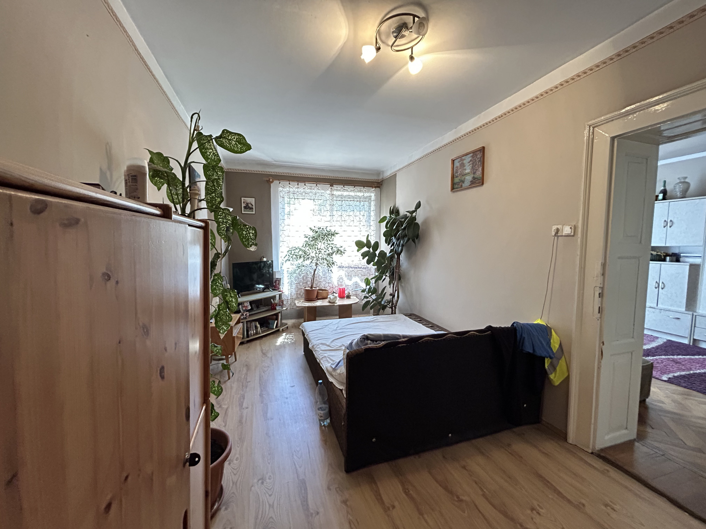 Dispozícia bytu: cez spoločný gánok vchádzate do chodbovej časti spoločnej pre 2 byty, vstúpite do miestnosti kt. je využívaná ako kuchyňa, z kuchyne sa vchádza do kúpeľne s vaňou, do 1 samostatnej izba, a do ďalších 3 izieb, ktoré sú priechodné.