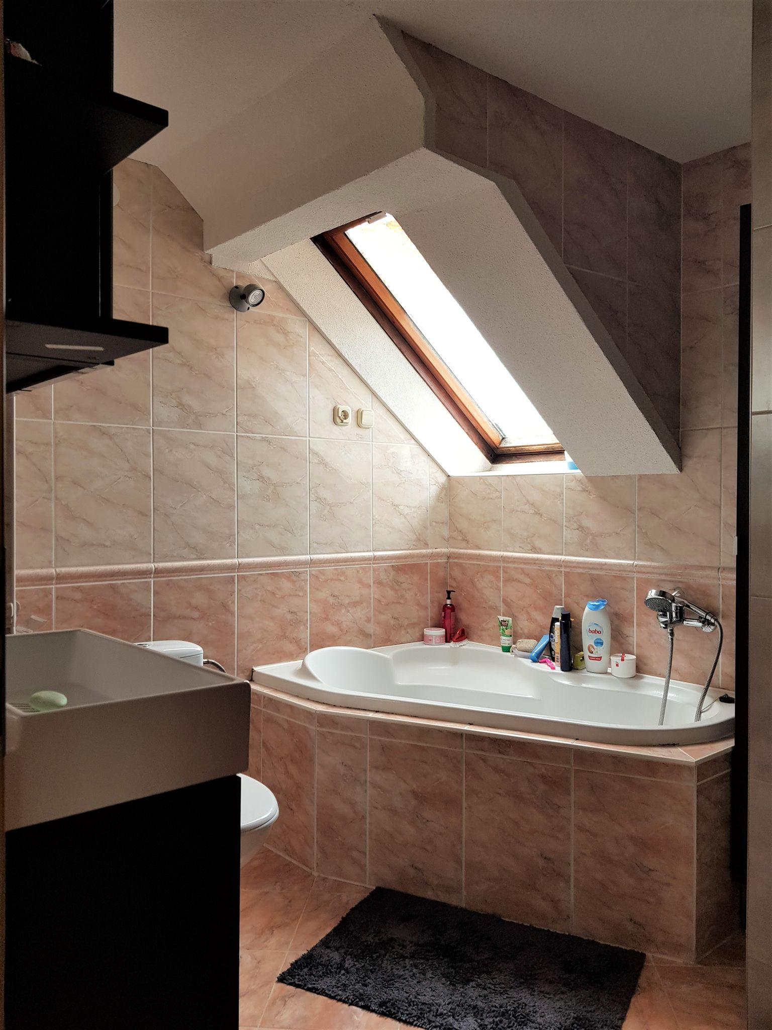 Poschodie: 2 izby, obývačka, kúpeľňa s vaňou a sprchovým kútom, WC.
