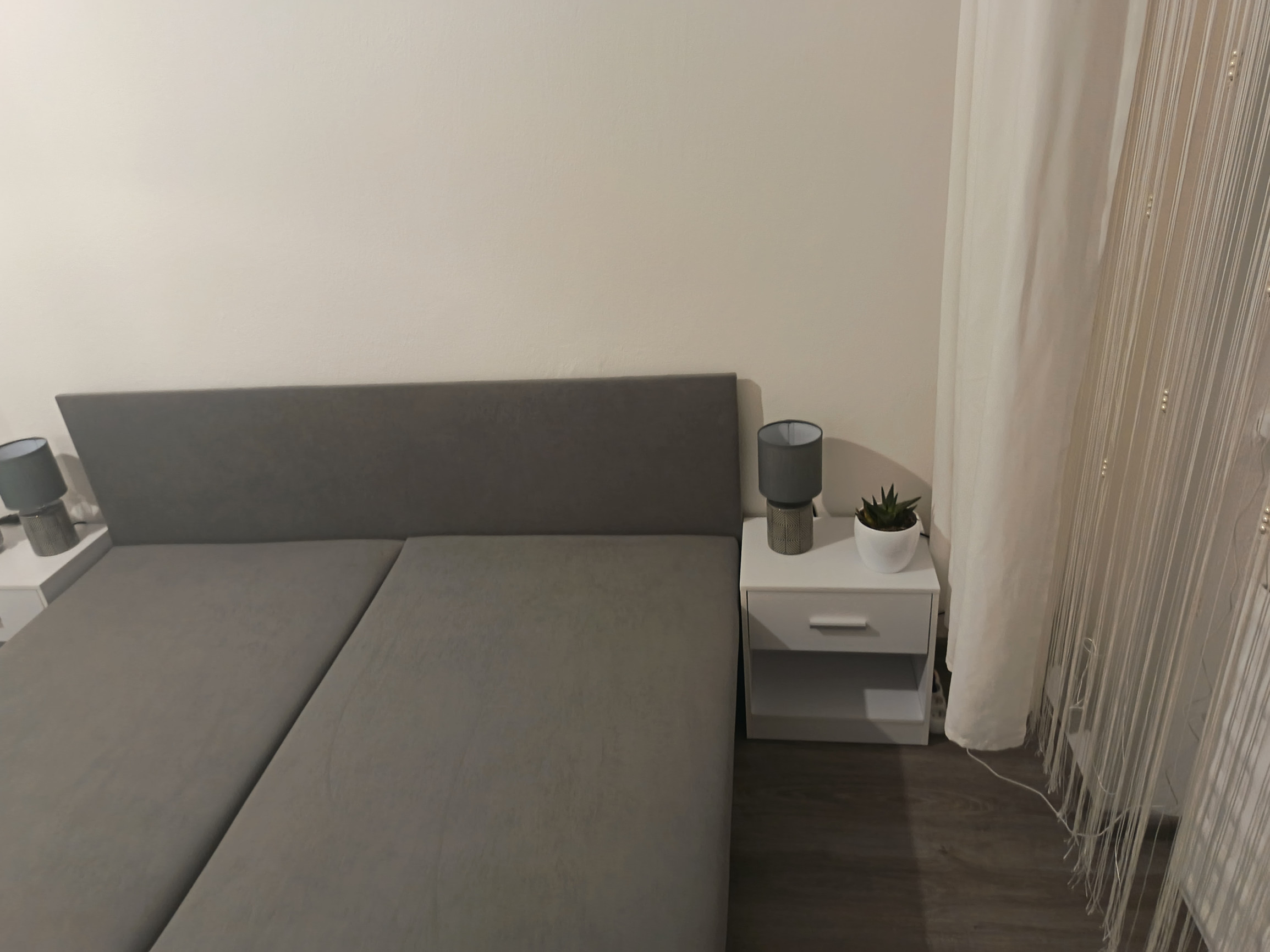 Byt pozostáva so spoločnej terasy, kde ma každý byt svoju vlastnú časť. Pri vstupe do bytu Vás poteší vstupná chodba spojená s kuchyňou. Po ľavej strane sa nachádza moderné zariadená kúpeľňa so sprchovym kutom a práčkou. Oproti vstupu je chodba, ktorá priestor spája s dvoma miestnosťami. Tým vytvára útulný dojem. Na ľavej strane je vkusne zariadená spálňa a na pravej strane obývacia izba s televízorom. Toto rozloženie zabezpečuje pohodlie a komfort pre Najomnika.