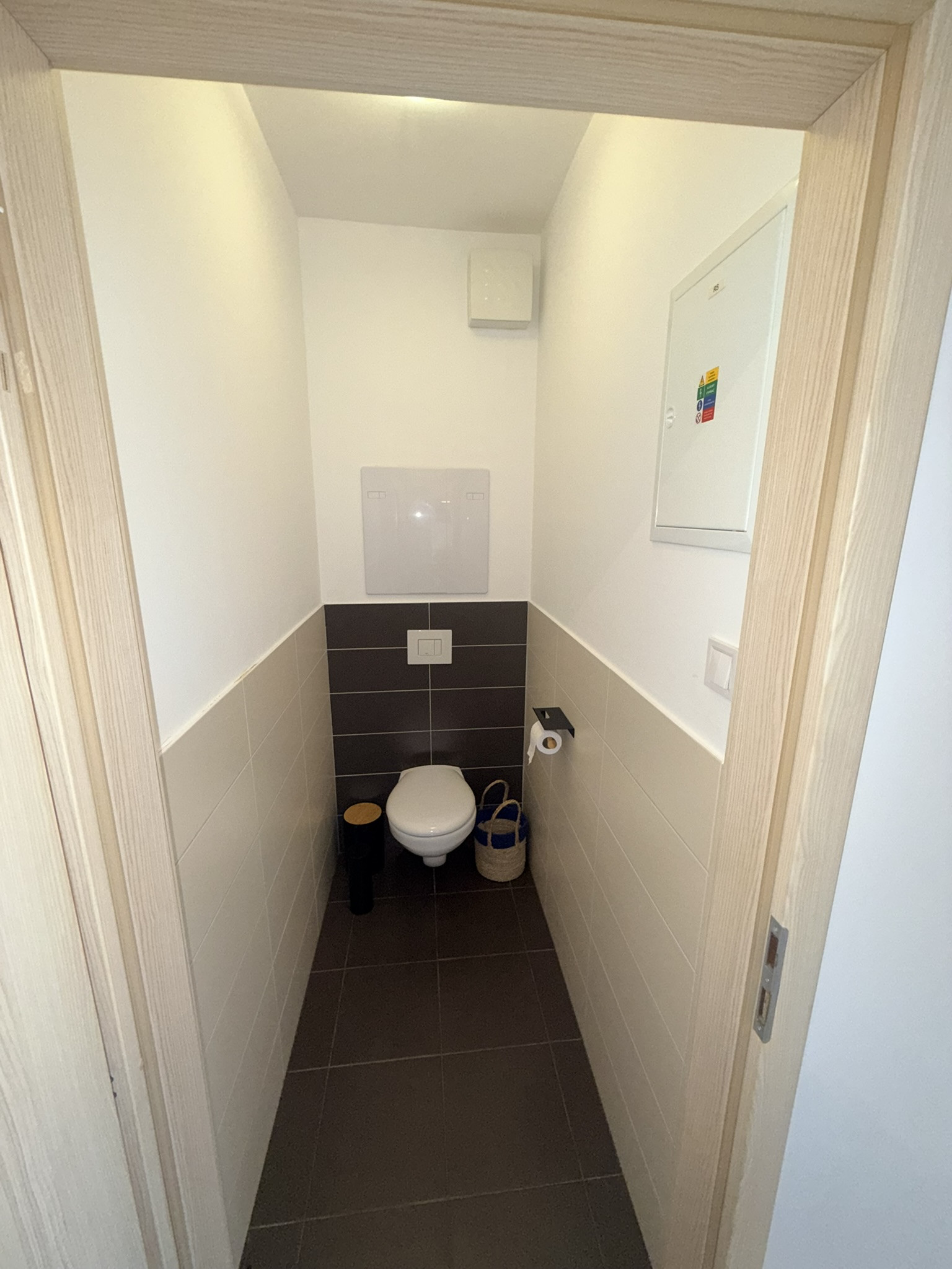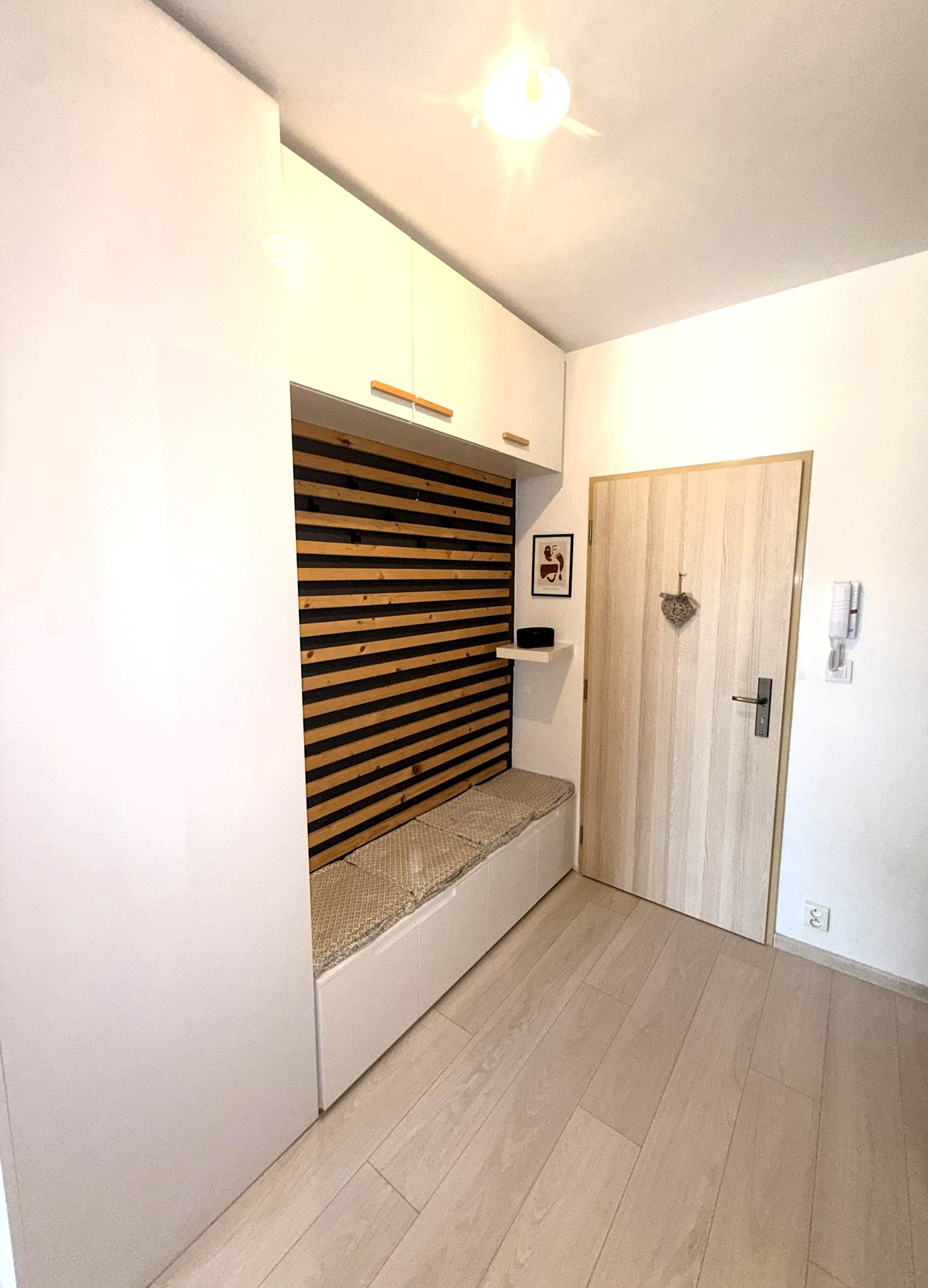 Dispozícia: Vstupná chodba s dostatočným úložným priestorom , oddelená miestnosť s policami, ideálna na vybudovanie šatníka , alebo skladu. Z chodby je vstup na samostatnú toaletu a takisto do kúpeľne s vaňou. Priestranná obývacia časť je klimatizovaná a prepojená s kuchyňou . Balkón orientovaný na západ poskytuje krásny výhľad na okolie , vstup z obývacej izby. Spálňa disponuje manželskou posteľou a vstavanými skriňami.