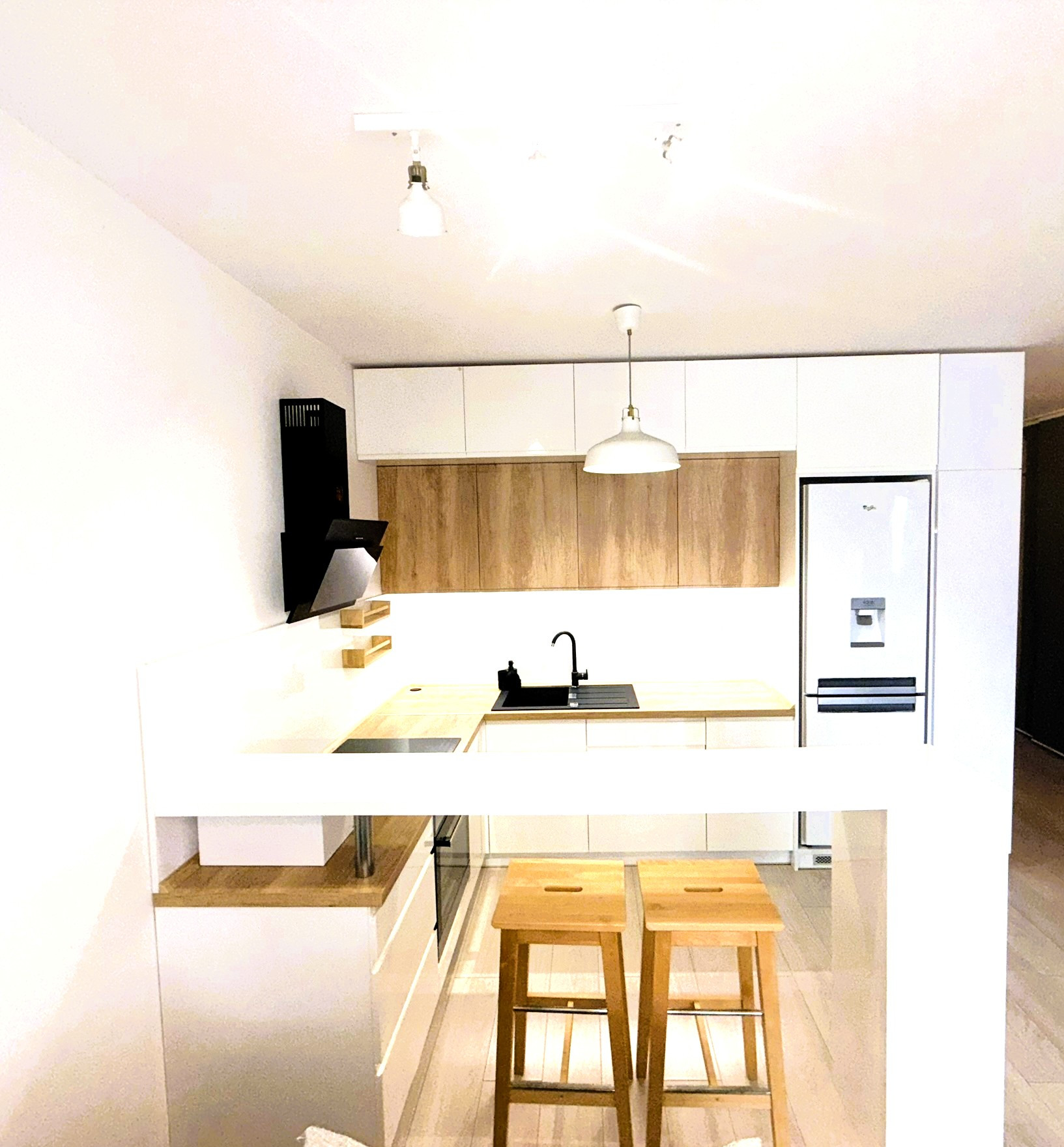 kuchyňa- chladnička Whirlpool, el.rúra a varná doska Elektrolux, umývačka riadu Bosch, barový pult so stoličkami