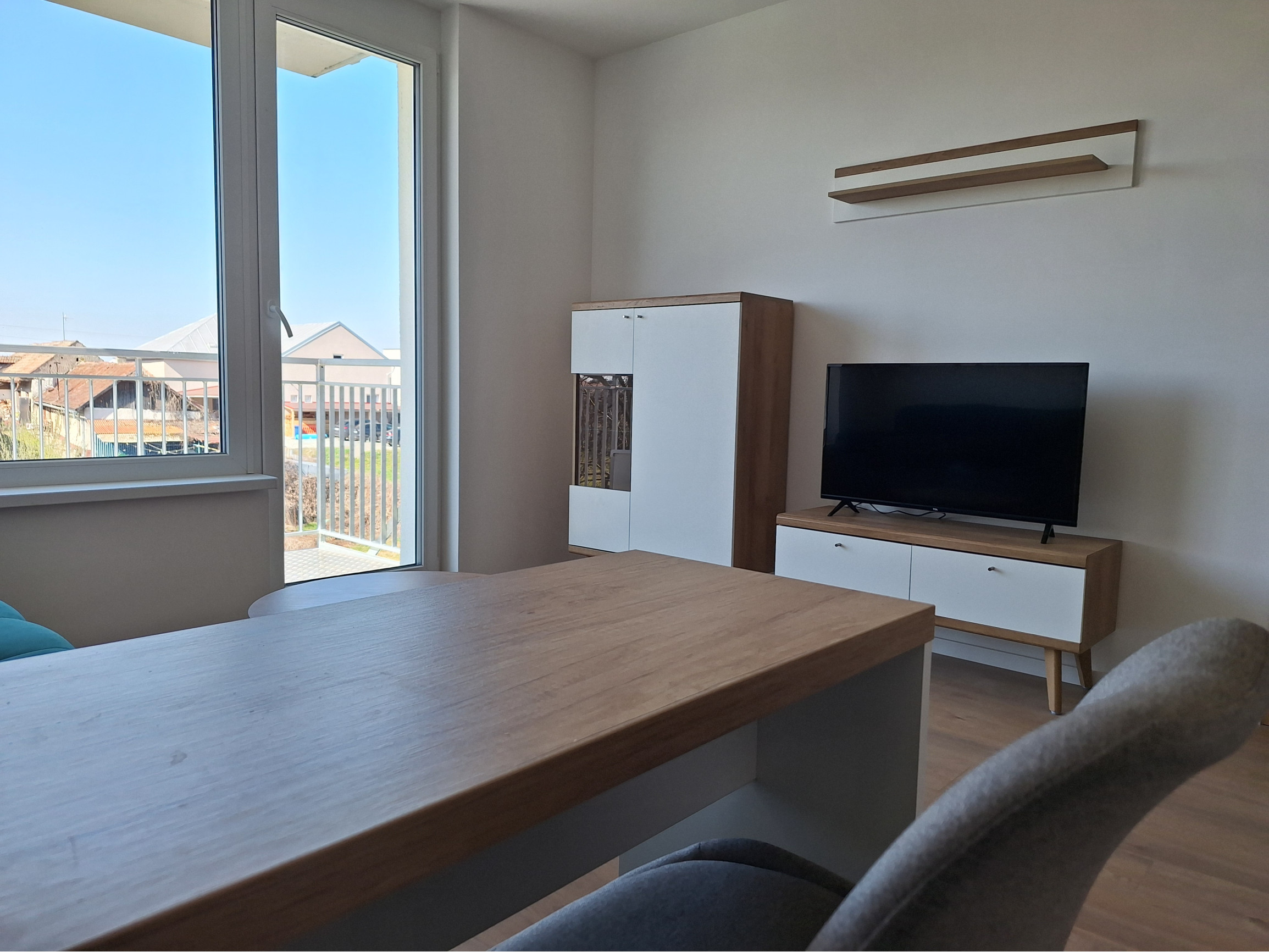 Súčasťou obývačky je kuchynská linka, raňajkový stolík, vstavané spotrebiče a práčka. Obývacia časť je tvorená rozkladacou sedačkou, konferenčným stolíkom, komódou, TV na tv stolíku. Z obývačky prejdete priamo na balkón s výhľadom na záhradky.